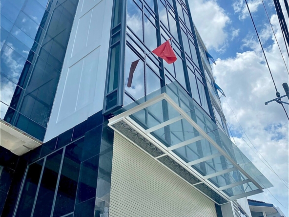 – Mặt ngoài tòa nhà được lắp full kính cường lực xanh đen hiện đại, phù hợp với xu hướng thiết kế cao ốc hiện nay.
